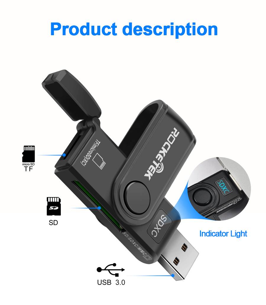 Устройство чтения карт памяти SD / Micro SD Rocketek USB 3.0 - отличный вариант для тех, кто ищет простой способ добавить поддержку наиболее распространенных типов носителей, используемых в обычных цифровых камерах, MP3-плеерах, мобильных телефонах и т. Д.
