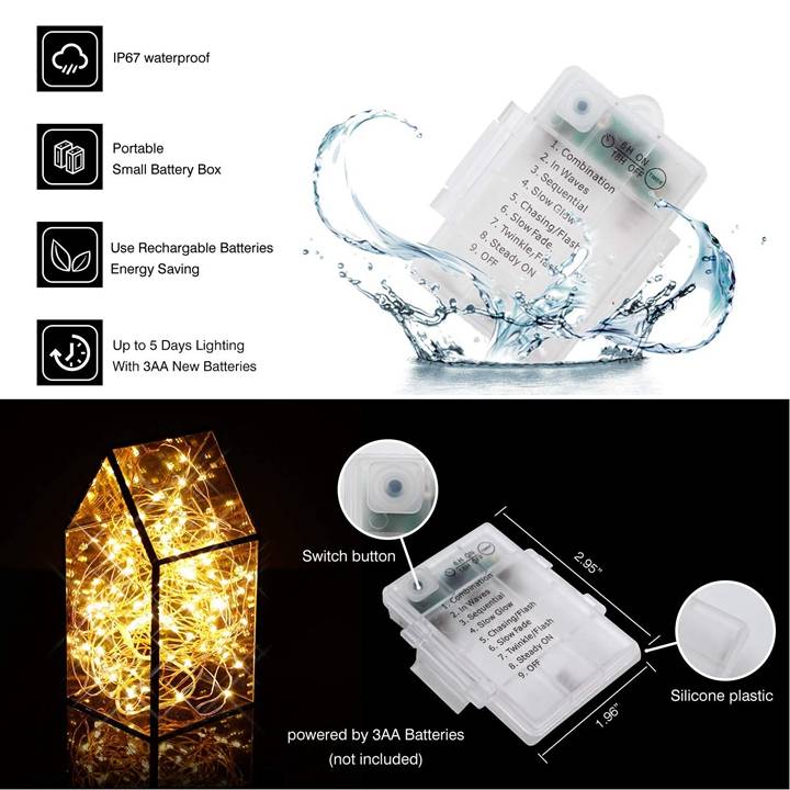 1 светильник с пультом дистанционного управления водонепроницаемым отсеком и 8 режимами синхронизации 2 обычных аккумулятора, медная проволока/серебряная проволока может быть водонепроницаемой или даже помещена в воду, но обратите внимание на защиту аккумуляторной коробки