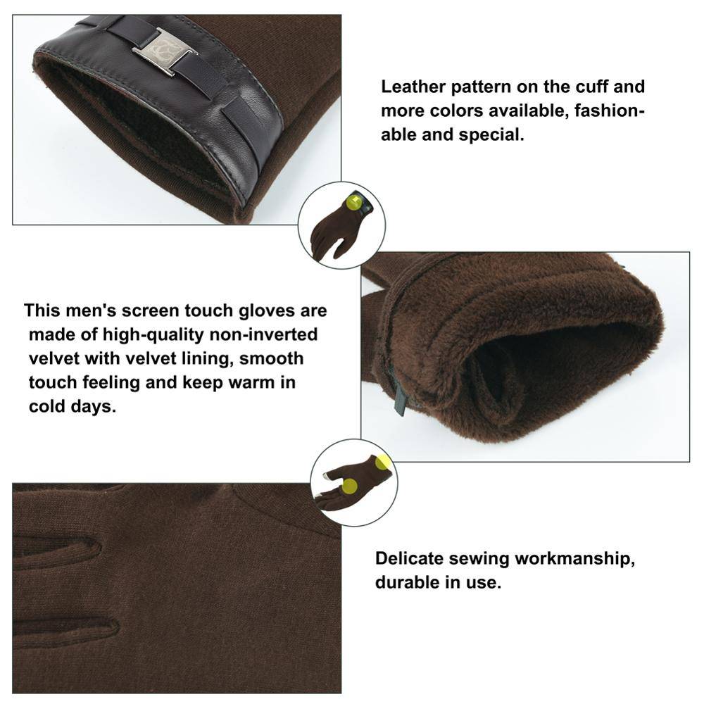 Эти мужские перчатки для сенсорного экрана изготовлены из высококачественного неперевернутого бархата с бархатной подкладкой, гладкие на ощупь и сохраняют тепло в холодные дни. Работает со всеми устройствами с сенсорным экраном, включая iphone, ipad, телефоны Android и т. Д. Кожаный узор на манжете и больше цветов в наличии, модный и особенный. Один размер подходит для большинства людей с хорошей эластичностью, подходит для активного отдыха зимой. Деликатный пошив, прочный в использовании. Если вы хотите узнать больше деталей или у вас есть какие-либо вопросы, пожалуйста, просмотрите подробную страницу или свяжитесь со службой поддержки клиентов.
