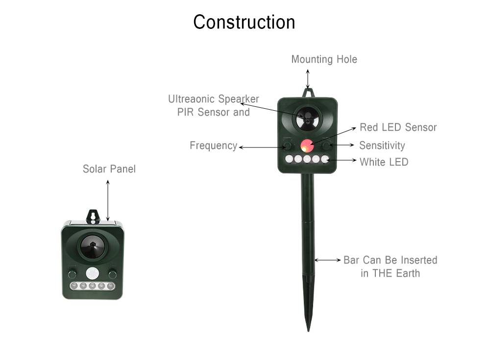 -Эффективное использование: Встроенный инфракрасный детектор и мобильный PIR детектор, инфракрасный луч обнаружит животных и удалит их, создавая звуковые волны.