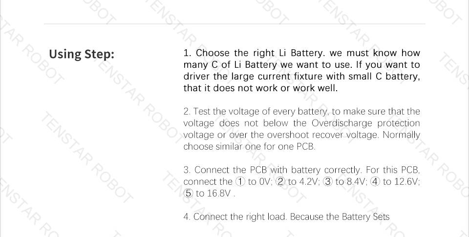 11,1 В (литий-ионный 18650 или литий-ионный аккумулятор Номинальное напряжение)12,6 V (литий-ионный аккумулятор полной зарядки напряжение)10,8 В (Lipo аккумулятор Номинальное напряжение)Плата защиты литиевой батареи не входит в комплект для сварки.BMS для активации: Применение 12,6 V литий-ионный аккумулятор зарядное устройство, чтобы зарядить его.Примечание:1) Эта плата не подходит для высокомощных электронных инструментов, если используется для отвертки и дрели, серия электрических велосипедов, рыболовная машина и 1 Вт Светодиодный, пожалуйста, не покупайте это.2) выше 3а устройства, означает, что скорость разрядки батареи составляет более 3с.Номинальная батарея 1C, 2000 мА · ч равен 2ач * 1 = 2А макс. рабочий ток.Номинальная батарея 3C означает 2ahx3 = 6A Максимальный рабочий ток.Балансировщик-это лишь вспомогательная функция, балансировка означает, что при зарядке батареи каждая серия батареи должна иметь одинаковое напряжение. В тех случаях, когда одна ячейка напряжение получить 4,2 V, другие клетки не, первая ячейка напряжения разрядится, когда вы будете ждать другие ячейки увеличивается до одной и той же уровне.