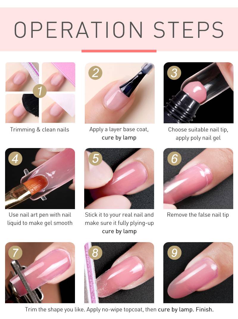 1. Обрезка и чистка ногтей 2. Нанесите слой Venalisa Базовое покрытие, вылечите лампой 1-2 мин. 3. Выберите подходящие накладные ногти, нанесите полигель Venalisa на кончик, используйте кисть для нейл-арта с раствором скольжения, чтобы сделать гель гладким и равномерным. 4. Наклейте его на настоящие ногти и убедитесь, что он полностью играется, вылечите лампой 1-2 мин. 5. Удалите накладные ногти, обрежьте и придайте им форму. 6. Нанесите слой venalisa закаленное верхнее покрытие, вылечите ногтевой лампой 1-2 мин, закончите!