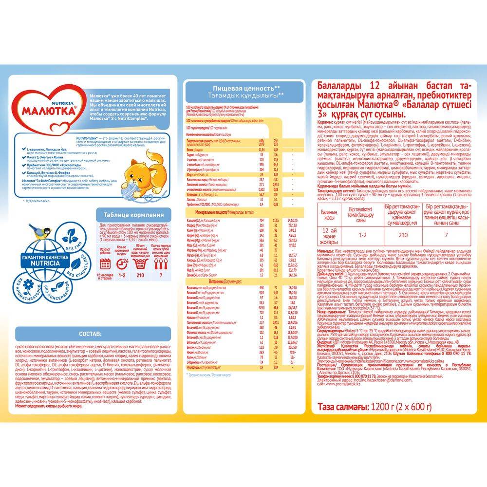 Рекомендация Национальной программы питания детей* 200 мл в день. Комплекс витаминов и минералов. Когда малышу исполняется год, он продолжает активно расти и развиваться, и, по сравнению со взрослым, у него повышенные потребности в витаминах и минералах. Из обычной еды малыш не получает их в достаточном количестве. Дополнить рацион ребенка необходимыми ему питательными веществами поможет детское молочко Малютка®. Согласно Национальной программе оптимизации питания детей от 1 года до 3 лет*, ежедневный молочный рацион ребенка должен состоять из 400-450 мл молочных продуктов, включая 200 мл детских молочных напитков 3 или 4 ступени. Из 200 мл детского молочного напитка ребенок получит (по сравнению с коровьим молоком): - в 5 раз больше железа; - в 2 раза больше витамина А; - больше витамина D. * Национальная программа оптимизации питания детей в возрасте от 1 года до 3 лет в Российской Федерации.