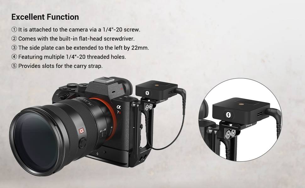 Кронштейн SmallRig L для камеры Sony Alpha 7 III / Alpha 7R III / Alpha 9 2122 Специально разработан для быстрого переключения между вертикальной и горизонтальной съемкой и для лучшего захвата. Он фиксирует камеру с помощью винта 1/4-20 на дне и оснащен резиновыми прокладками на опорной плите для предотвращения царапин и скручивания. И опорная плита, и боковая пластина имеют стандарты Arca-Swiss с ценовыми отметками. Боковая пластина может быть расширена влево, если требуется больше места для подключения или кабеля. В дверце батарейного отсека используется конструкция вращающегося вала, чтобы аккумулятор можно было быстро заменить, вращая и открывая дверцу аккумулятора. С несколькими резьбовыми отверстиями 1/4 "-20 сбоку для крепления аксессуаров, таких как Крепление для холодной обуви BUC2736 И Кабельный зажим 2259. Рукоятка оснащена кожаными накладками для поддержки Пинки и улучшения комфорта при захвате. Кроме того, пластина L обеспечивает прорези для ремня для переноски и поставляется с отверткой с плоской головкой, чтобы закрепить винт камеры и хранить его в нижней части кронштейна L.