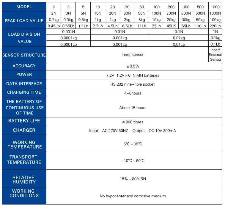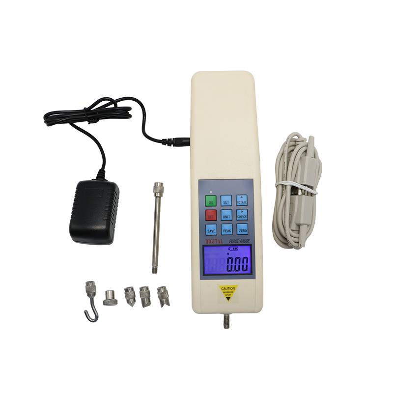 Датчик силы имеет преимущества высокой точности, простоты в эксплуатации и переноске. Более того, он имеет виды режимов тестирования, удобство для conner, и он может хранить и вводить данные в компьютер для анализа статистики, а также составляет тестеры с различными функциями, комбинирование с тестовыми грядками и зажимом. Пользователи могут вводить локальное ускорение гравитационного значения, чтобы сделать тест более точным.