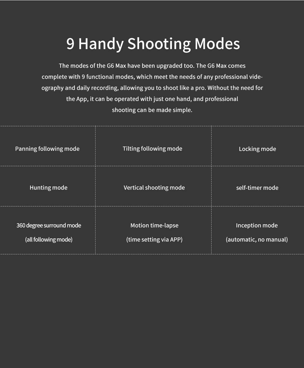 Новые и улучшенные с высоким крутящим моментом, магнитные, бесщеточные двигатели похвастаются 50% увеличением выходной мощности, что делает карданный стабилизатор совместимым с беззеркальными камерами, смартфонами, спортивными камерами и компактными камерами.