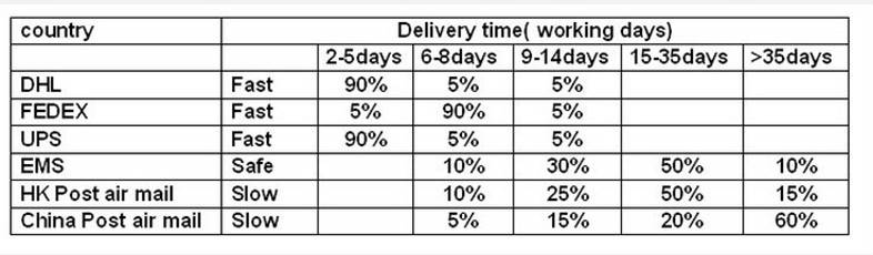 Доставка почтой Гонконга доставку авиапочтой и Почта Китая доставку авиапочтой обычно занимает 15-45 дней, и некоторые страны, такие как Бразилия, Аргентина... нужны более 50 дней, пожалуйста, проявите терпение и не стесняйтесь спрашивать нас, чтобы продлить срок поставки. Или если вы хотите получить более быструю доставку, пожалуйста, свяжитесь с нами, чтобы оплатить дополнительную стоимость срочной доставки.