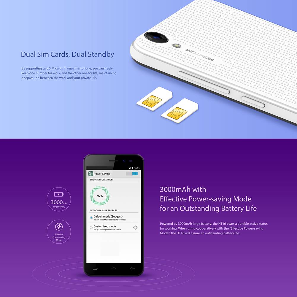 HOMTOM HT16 Смартфон имеет Android 6,0 Quad core Процессор MTK6580. Продукт имеет две камеры и поддерживает TF карту до 64G extended.