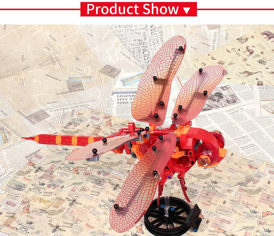 Ручные функции вращают хвост на 360 °, управляют крыльями, хлопающими в воздухе. Этот технический Набор строительных блоков поставляется с красной схемой стрекозы.