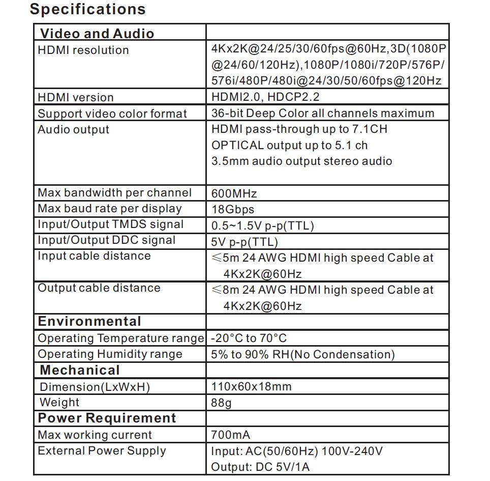 HD 2,0 конвертер экстрактор HD в HD и оптический TOSLINK SPDIF + 3,5 мм стерео аудио экстрактор поддержка 4K 3D ARC HDCP2.2Этот аудиоконвертер HD в HD + позволяет подключить источник HD кОдин HD-дисплей и дополнительно один L + R и оптический аудиовыход.Содержимое упаковки1 преобразователь HD1xадаптер питания1 X Руководство пользователя1 штекер 3,5 мм для штекера RCA