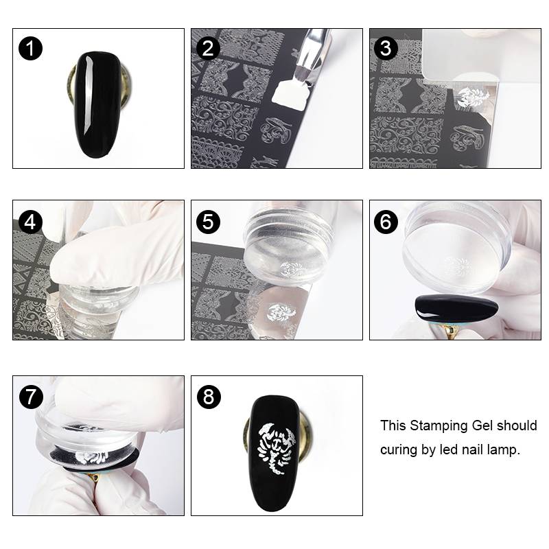 -1. Нанесите базовый цвет на гвоздь с помощью базового покрытия и лечения. -2. Нанесите Rosalind штамповочный гель на штамповочные пластины. -3. Используйте прозрачный скребок геля. -4. Нажмите кнопку stamper и выберите шаблон. -5. Передача на ноготь. -6. Отклейте латекс для ногтей. -7. Нанесите верхнее пальто и вылечите. -8. Готово.