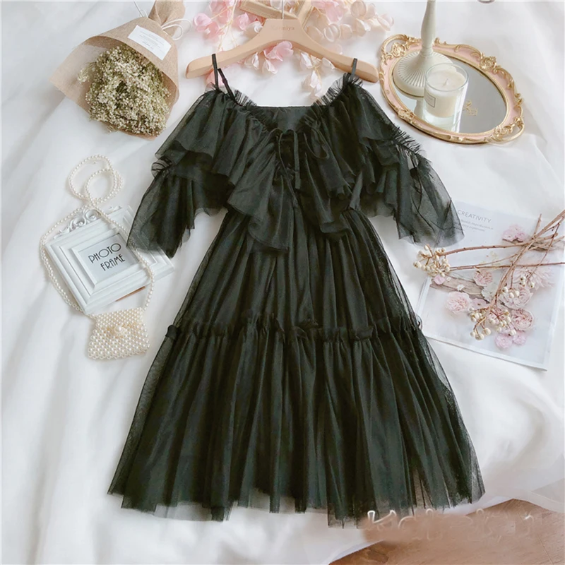 Женское Сетчатое платье с оборками в стиле бохо, элегантное черное платье, вечерние женские платья, летняя Корейская одежда Kawaii Lolita 2020Бесплатная доставка оптом и в розницу!