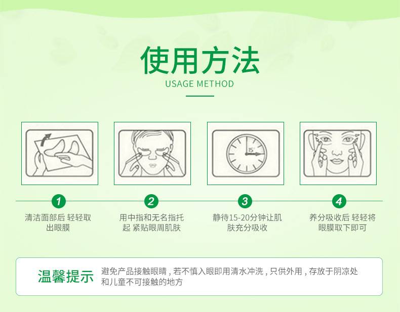 [Метод использования] 1. Очищает кожу, делает ее чистой. 2. Приклейте маску для глаз, аккуратно нажмите пальцами, чтобы быть ближе. 3. Снимите маску через 10-15 минут, мягко массируйте, чтобы впитать, не нужно мыть снова.
