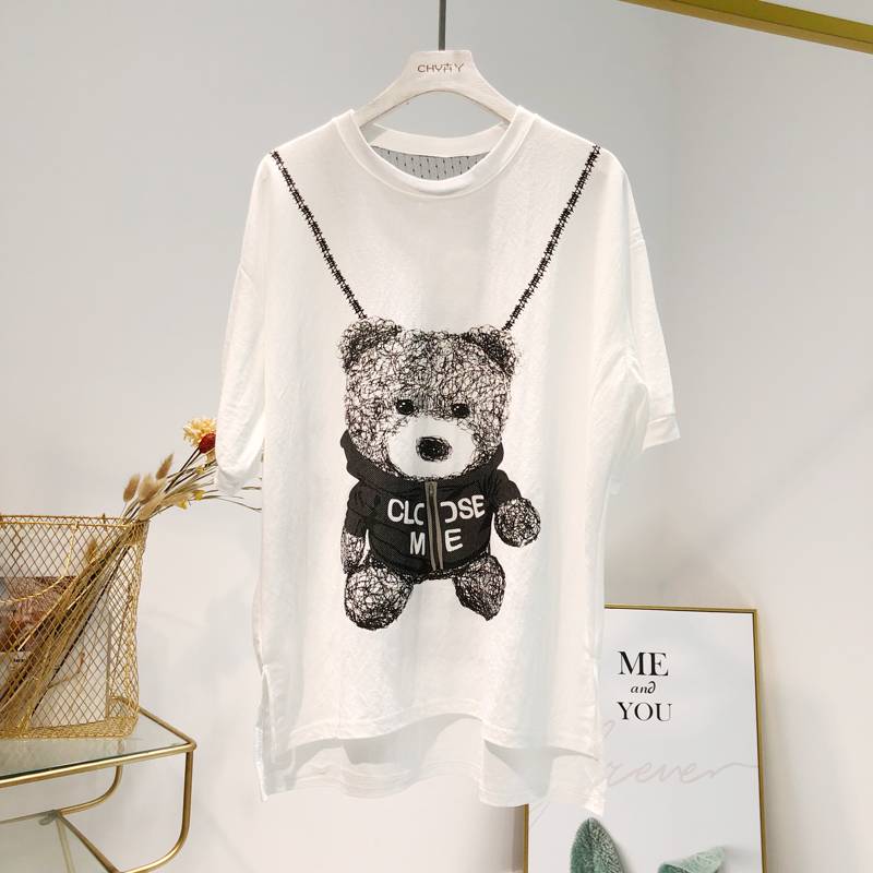 Популярная белая футболка с забавным принтом Ins для лета, популярная Футболка с принтом медведя, хлопковая Футболка с задней частью, новинка, женская футболка Harajuku