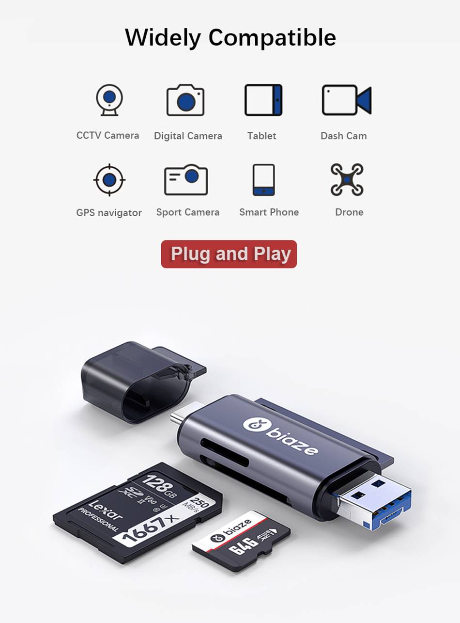 -Поддержка чтения карт SD/Micro SD одновременно -Максимальная скорость передачи данных 5 Гбит/с -Совместимость с системами Windows/Mac OS/Linux -Слот SD: SD, SDHC, SDXC, RS-MMC, MMC -Слот Micro SD: Micro SD, Micro SDHC, Micro SDXC Универсальная совместимость -Ноутбук USB C: Macbook, MacBook Pro, HUAWEI Matebook, Dell XPS 13/15, Chromebook Pixel и так далее. (порт usb-c необходим для поддержки функции передачи данных) -USB C смартфон/планшет: iPad Pro 2018, Samsung Galaxy S10/S9/S8, Huawei P30/P20/P10/Mate20/Mate10, Google Pixel и так далее. (порт usb-c необходим для поддержки функции передачи данных) -Все компьютеры USB A Примечание: -Разъем USB A и USB C нельзя использовать одновременно. -Для смартфонов Samsung и Google формат файла карты памяти должен быть FAT32/EXFAT, NTFS не поддерживается. -Пожалуйста, убедитесь, что ваш мобильный телефон поддерживает функцию OTG, если вы покупаете этот кард-ридер для мобильного телефона
