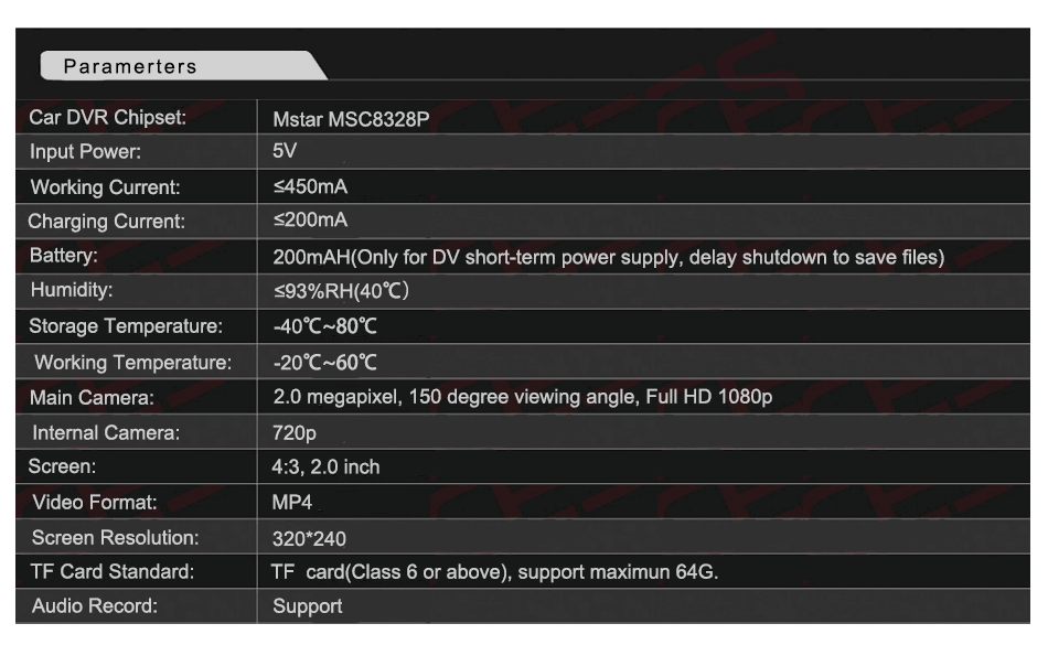 Brand NameRuccessPixels200MegaTouch ScreennoDisplay Size<3"BatteryBuilt-inOriginal PackageYESItem TypeCar DVRSpecial FeaturesWide Dynamic RangeSpecial FeaturesCyclic RecordingSpecial FeaturesmicrophoneSpecial FeaturesDual LensSpecial FeaturesSD/MMC CardSpecial FeaturesGPS TRACKERSpecial FeaturesAnti VibrationSpecial FeaturesNight visionSpecial FeaturesG-sensorSpecial FeaturesTime&Date DisplaySpecial FeaturesOthersSpecial FeaturesCycle RecordingInterfaceMicro SD/TFInterfaceUSB2.0Chipset ManufacturerMSTARVideo CodeH.264Rear CameraYESDisplayIPSVideo FormatMPEG-4Battery Life3-5 seconds for protecting the file when shut downOSD LanguageRussianOSD LanguageChinese (Simplified)OSD LanguageEnglishOSD LanguageRussiaCamera Resolution1920x1080GPS loggerExternalView angle150°-160°Frames Per Second30Max External Memory64GMemory Card Required Reding SpeedClass 10Imaging SensorAR0238Assembly ModePortable RecorderNumber Of Lenses2Screen Ratio4:3Measurement unit100000015Sold insell_by_pieceEach pack1Package weight0.700Package size - length (cm)10Package size - width (cm)20Package size - height (cm)10ChipsetMSTAR MSC8328PModelcar dvr camera gpsFunctioncar dvr camera dual lensFunction 1car dvr camera hd dual cameraFunction 2dual lens dash camFunction 3dash cam full hd 1080p gpsFunction 4dual dash cam full hdFunction 5car dvr full hd 1080pFunction 6car dvr dual lens car camera full hdFunction 7car dvr dual lens camera 1080p