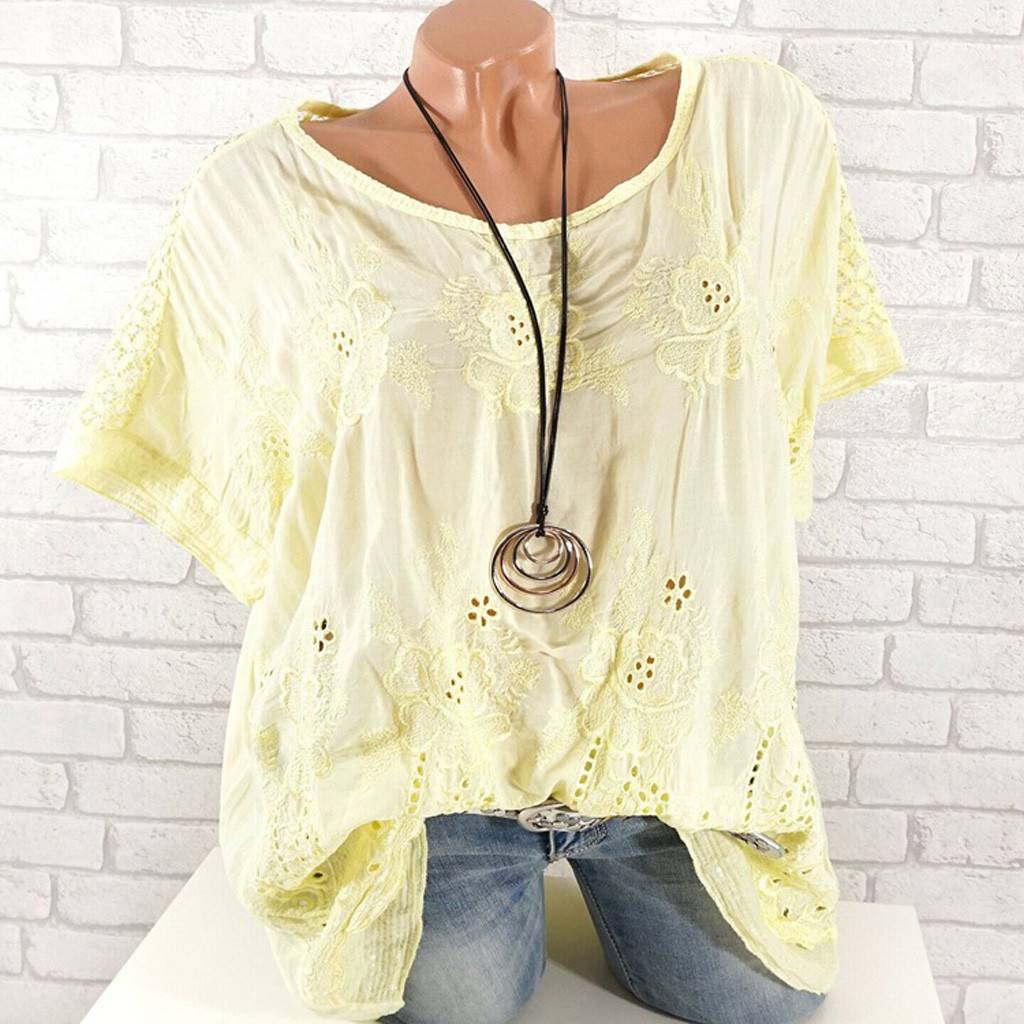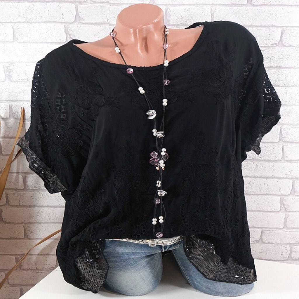 Женская Повседневная кружевная однотонная Свободная блузка с коротким рукавом, большие размеры