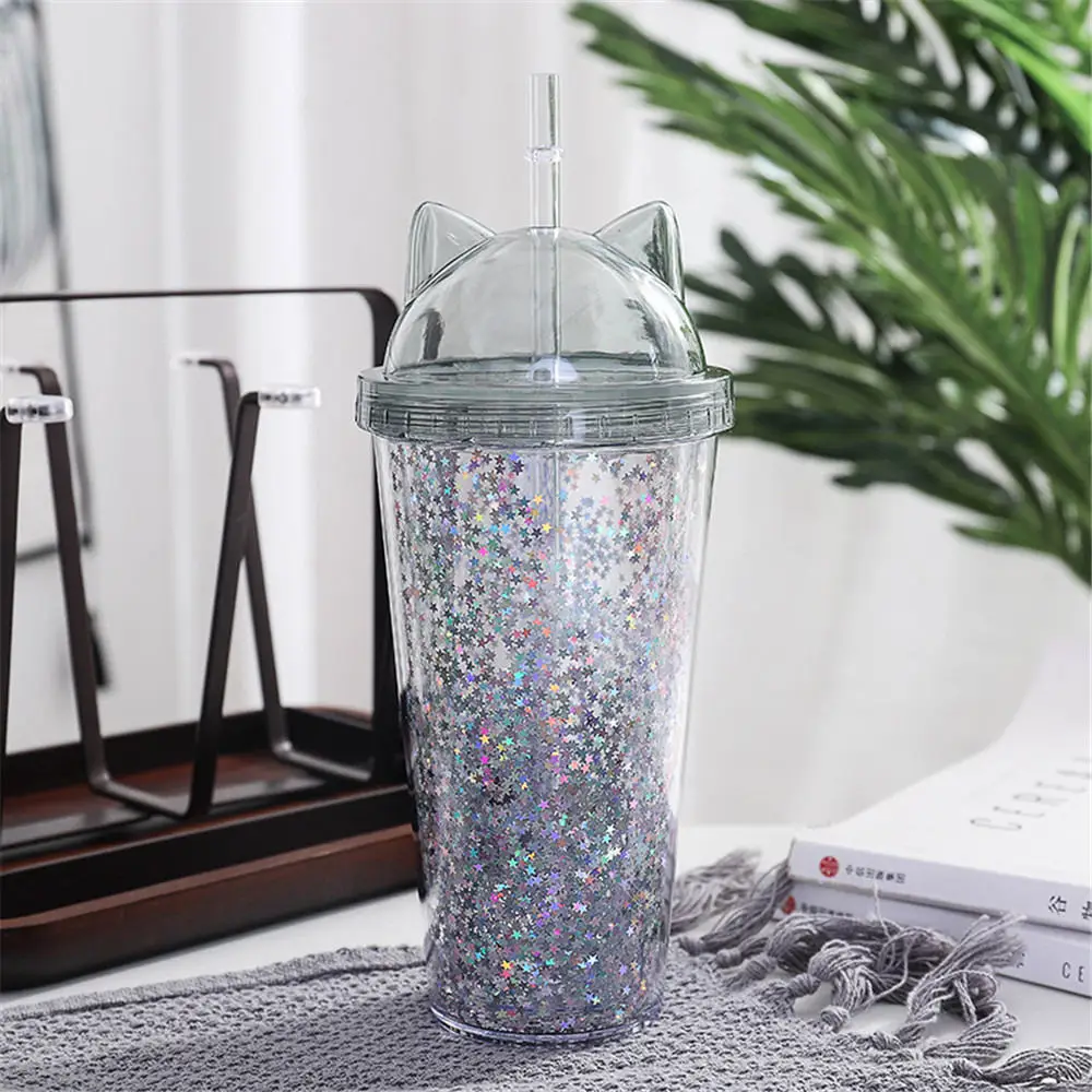 420 мл двухслойная бутылка для воды с блестками Летняя Милая соломенная чашка с кошачьими ушками Молочный Сок кофейная бутылка для напитков шикарная пластиковая посуда для напитков