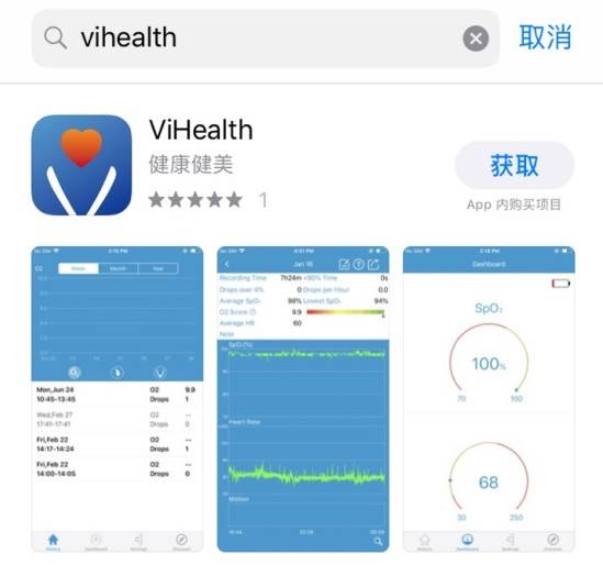 Бесплатное приложение для мобильного: приложение Vihealth показывает Графический отчет о спящем состоянии и тенденции насыщения крови кислородом, пульса и движения. Загрузите приложение Vihealth в APP Store или Google Play.