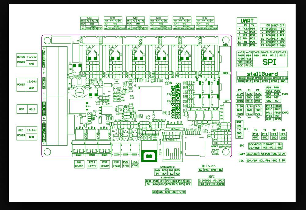 6 моторов, 3 экструдера, 3 вентилятора с ЧПУ. Резерв около 20 Расширительных портов, включает BL Touch, PWM, ADC, UART, I2C и SPI.Поддерживающий датчик для автоматического выравнивания кровати: BLTouch