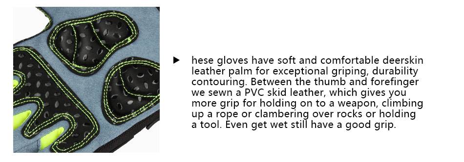 Перчатки-Эти перчатки имеют мягкую и удобную ладонь из оленьей кожи для исключительного удерживания, долговечности и контурирования. Между большим и указательным пальцами Мы пришили нескользящую кожу из ПВХ, которая дает вам больше захвата для удержания оружия, подъема по веревке, зажима по камням или удержания инструмента. Хорошо держится даже при намокании.