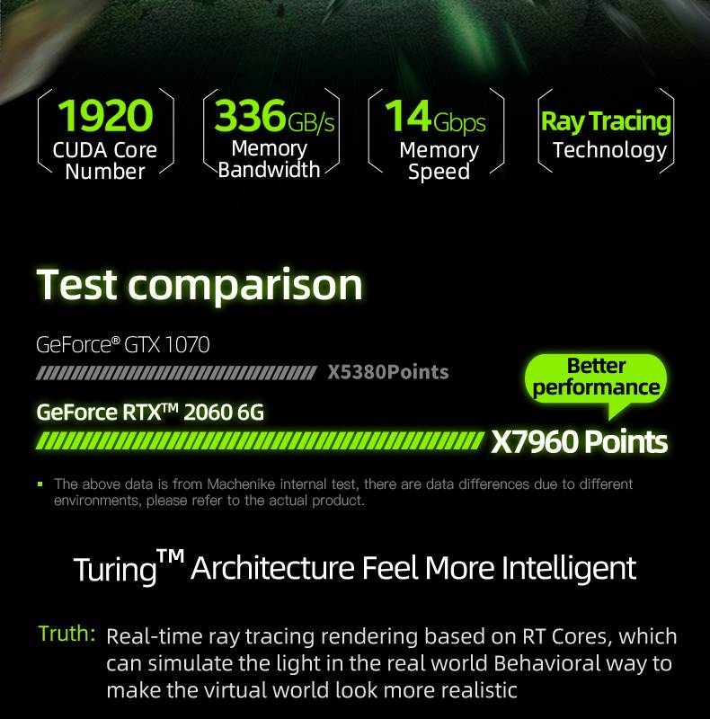 Оснащен GeForce RTX™Видеокарта 2060, производительность памяти 6G GDDR6 еще лучше. Революционная технология видеокарты сочетает в себе NVIDIA Turing™Архитектура и новый RTX™Платформа., Более Реалистичная игровая картинка, более высокая скорость рендеринга изображений и более высокий коэффициент энергоэффективности.