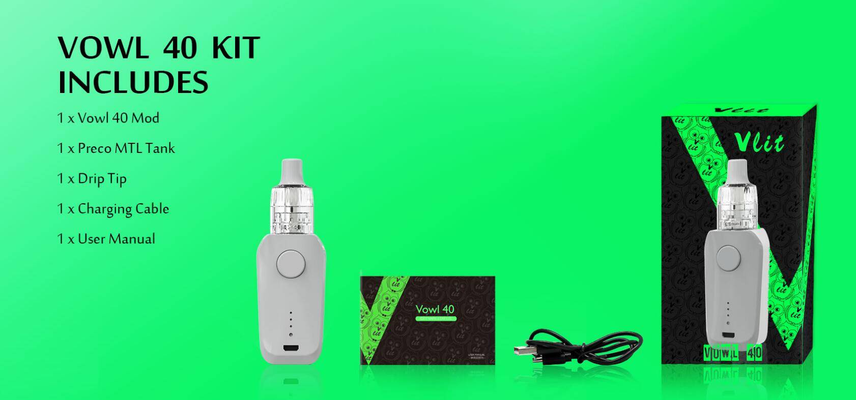 1 × Vzone Vowl 40 Вт мод 1 × бак Vzone Preco MTL 1 × капельный наконечник 1 × зарядный кабель 1 × руководство пользователя