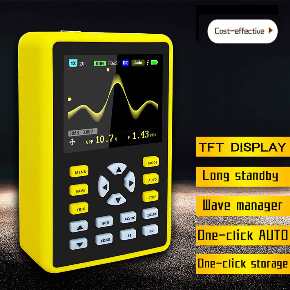 5012H является универсальным, очень практичным и эффективным портативным осциллографом для индустрии технического обслуживания и НИОКР. FNIRSI имеет частоту дискретизации в реальном времени до 500 мс/с и аналоговую полосу пропускания 100 МГц.