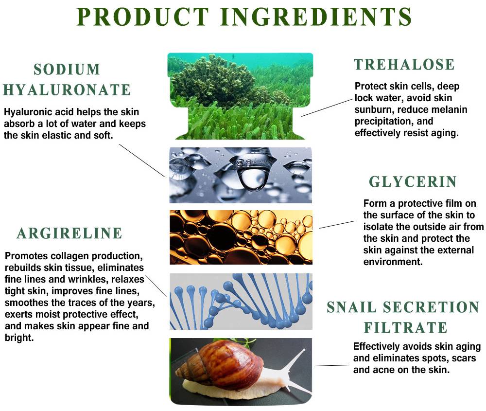 Ингредиент: вода, глицерин, Трегалоза, фильтрат секреции улитки, ацетил hexapeptide-8, экстракт гамамелиса виргинианы, гиалуронат натрия, овсянка (Авена сатива) бета-глюкан, гидроксиэтиловое волокно, карбомер, триэтаноламин, аллантоин, масло семян бабассу глицерин polyether-8 эфир, метилпарабен феноксиэтанол, хлорфенил гликоль.