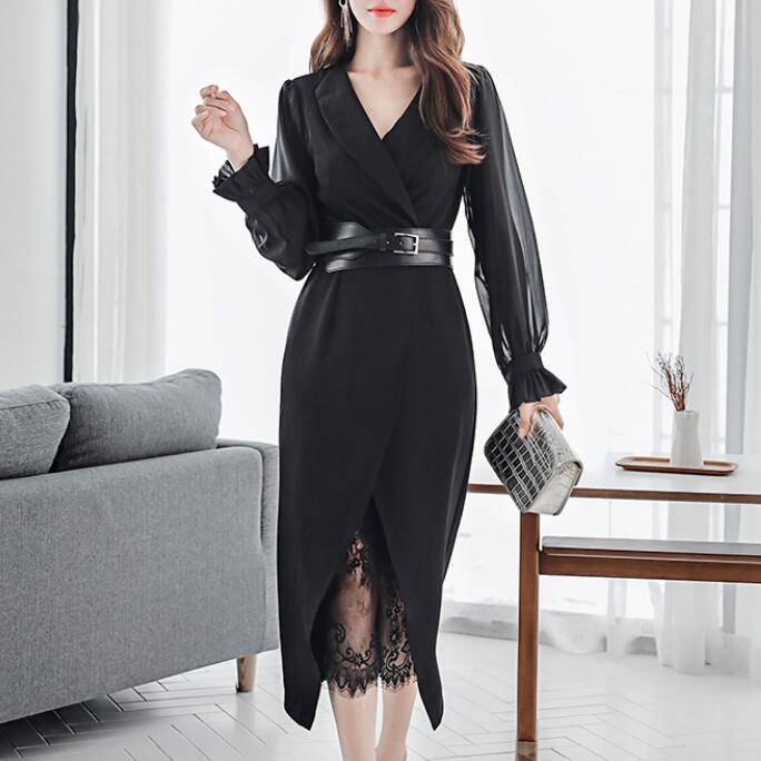 Женский шифоновый блейзер с длинным рукавом и кружевное платье, комплект из двух предметов, сексуальная офисная одежда, Новинка осени 2019