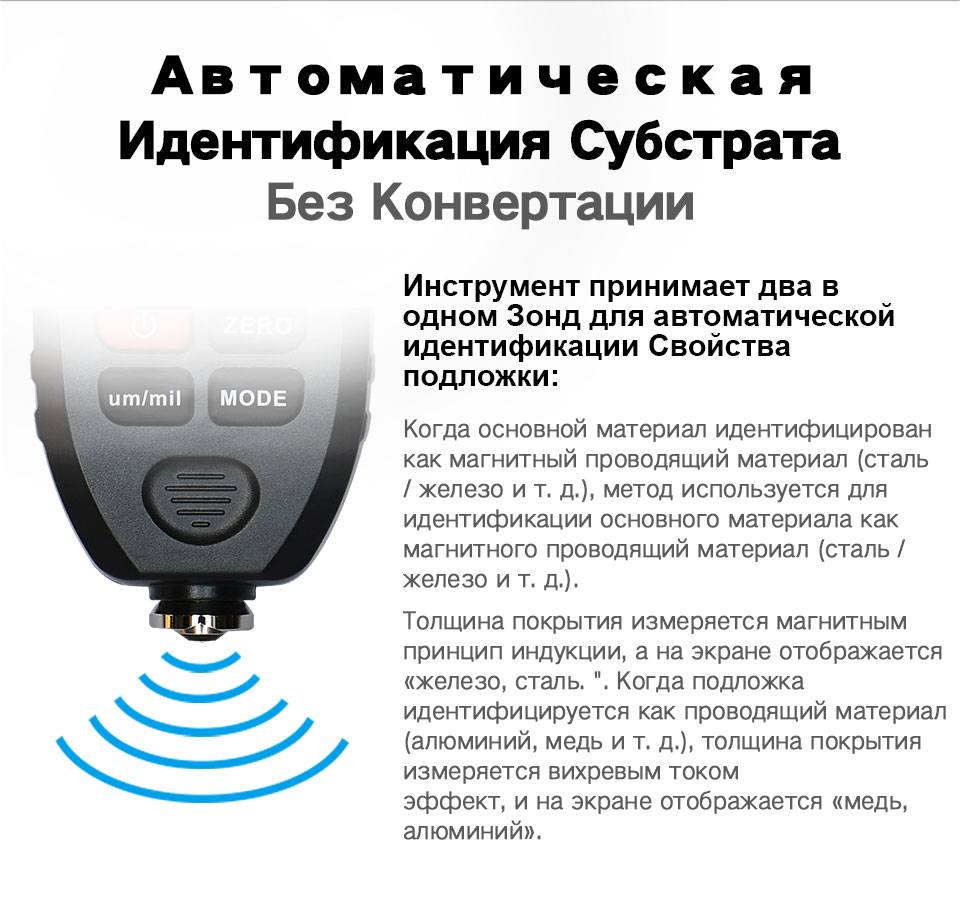 Толщиномер используется для измерения толщины покрытого и покрытого листа на металле, например, краски/эмали/хрома на стали, краски и анодированного покрытия на алюминии/меди. Датчик принимает прецизионный интегрированный зонд, и использует принцип электромагнитной индукции и вихревого тока, который автоматически определяет атрибут субстратов.