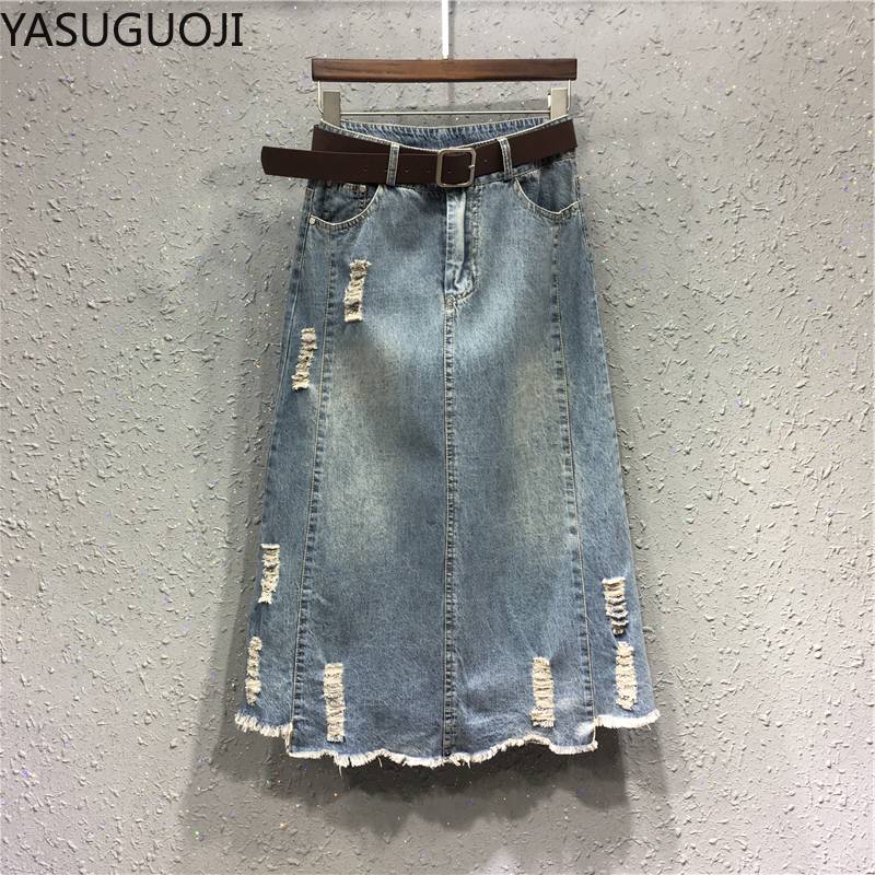 YASUGUOJI 2020, трапециевидная джинсовая юбка, длинные прямые юбки, женские летние синие винтажные голо-юбки, джинсовая женская одежда юбки с ремнем