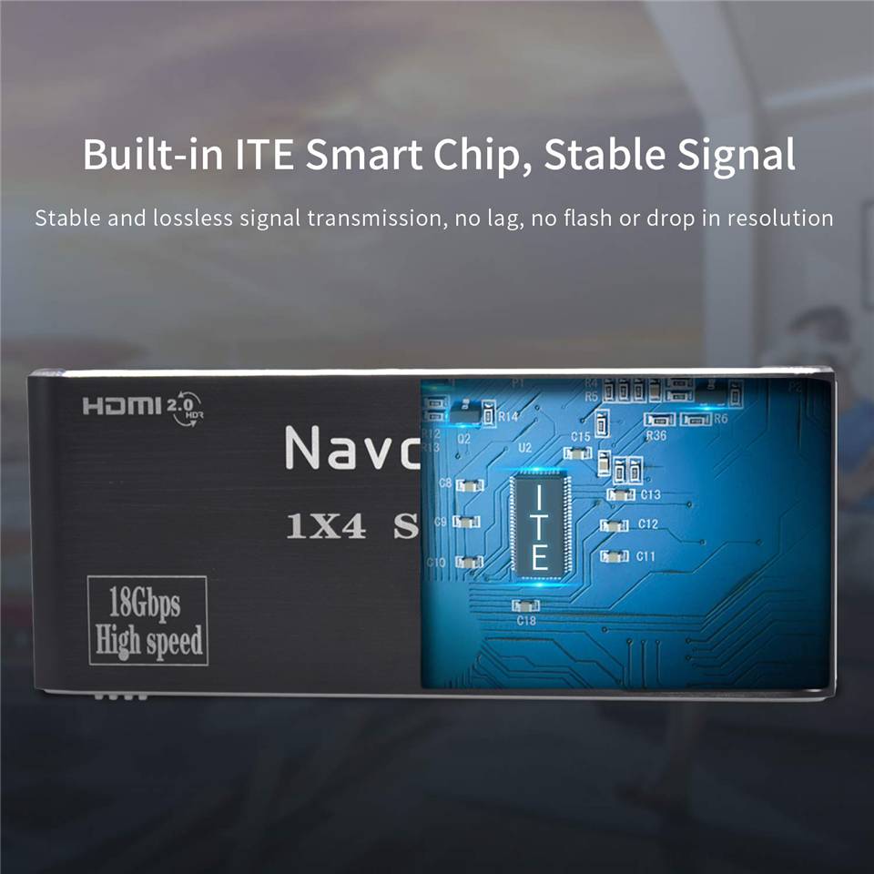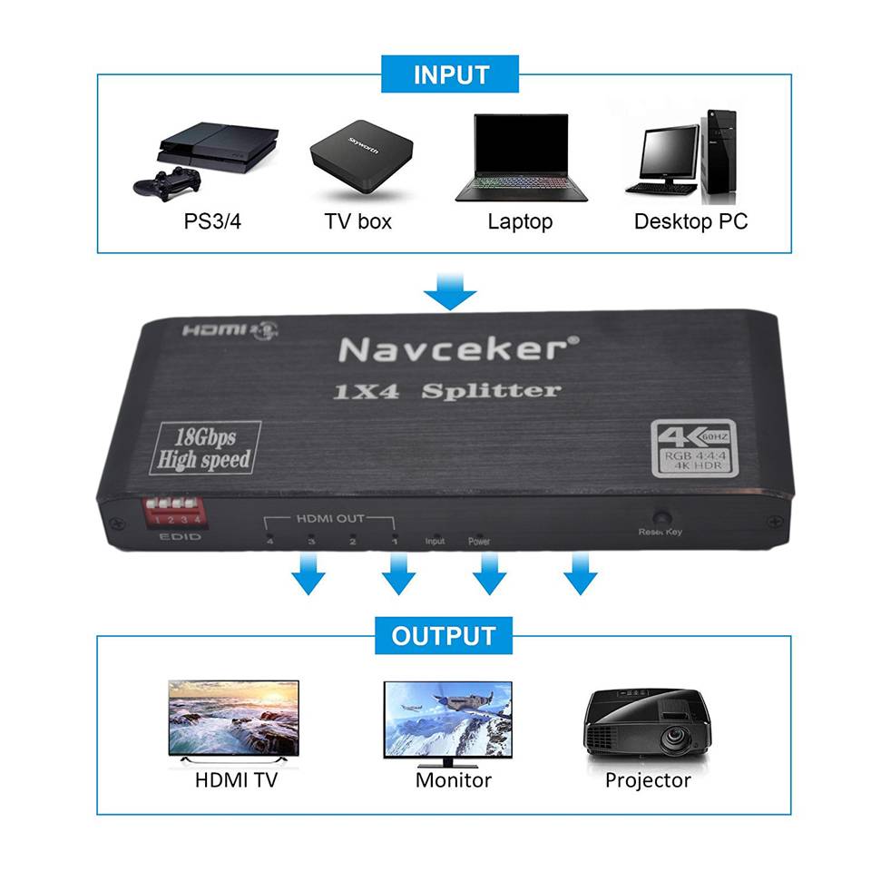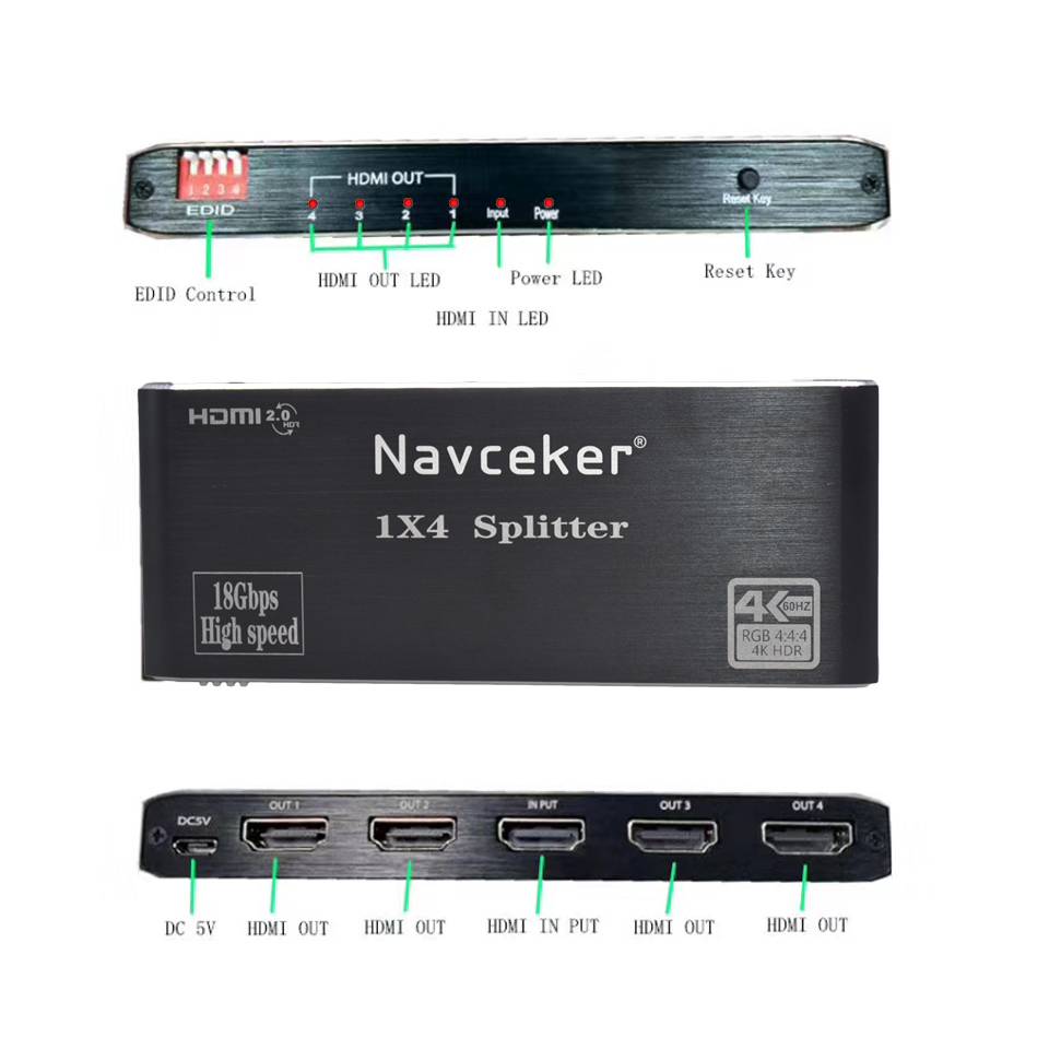 ZY-HS200, Navceker 1x2 1x4 HDMI 2.0b разветвитель использует один HDMI источник, доступ к нескольким HDMI раковины. Это позволяет легко разделить одно устройство HDMI на 4 совместимых с HDMI мониторов или проекторов. Кроме того, его можно поместить в конце длинного кабеля HDMI для регенерации сигнала HDMI. Разрешение этого hdmi сплиттера может быть до 4K x 2K @ 60Hz.