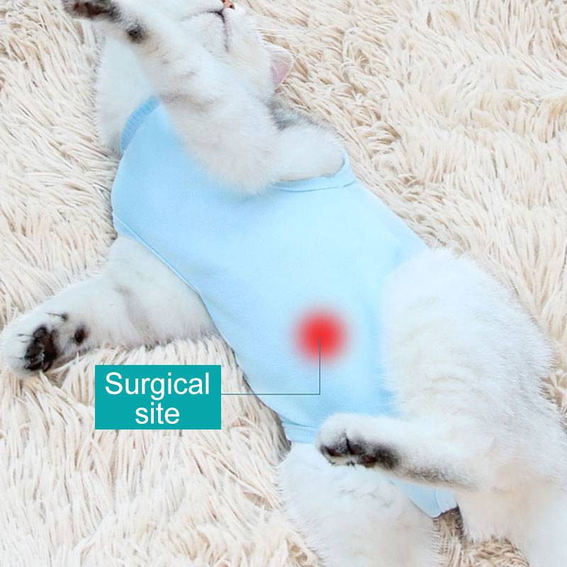 Features: 1. Collar Alternative: no need to wear collar when wearing surgical clothes to prevent infection caused by pet licking wounds, while also more comfortable, and the large block of coverage can stop licking desire. 2. Firm: the design is according to the cat's body shape, which is closer and prevents shedding,licking and keeping hand and surgical wounds stable. It can protect the wound from foreign objects directly, accelerate wound healing after surgery, and recovery rapidly after sterilization. 3. Material: the polyester fabric is breathable and comfortable, soft and durable, and easy to clean and dry quickly, and has no smell. 4. Exquisite Craft: the design of hind leg is humanization makes the wearing and excreting have no influence, and the limbs binding is not easy to off-line. 5. Convenient: the sticker design is adjustable flexibly to make cats more comfortable. The light color style is easy to know the situation of the wound so that they can get the timely care when there are accidents
