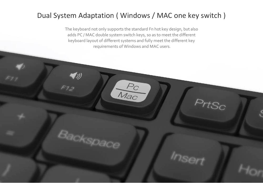 Клавиатура не только поддерживает стандартный дизайн горячих клавиш Fn, но alsoads PCIMAC двойные клавиши переключения системы, таким образом, чтобы удовлетворить различные раскладки клавиатуры систем diferero и полностью удовлетворить ifferent ключевые требования пользователей Windows и MAC.
