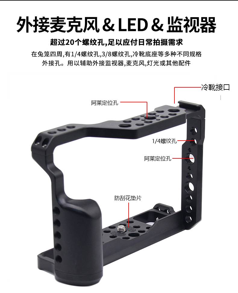 Особенности: Цельнометаллический материал, цельный полый дизайн, высокоточная обработка с ЧПУ, обработка поверхности анодом против окисления, точная Позиционирование и твердая безопасность. Специально разработан для Fujifilm XT2 XT3 Спецификация: Модель: клетка XT3CAGE Материал: металл Цвет: черный