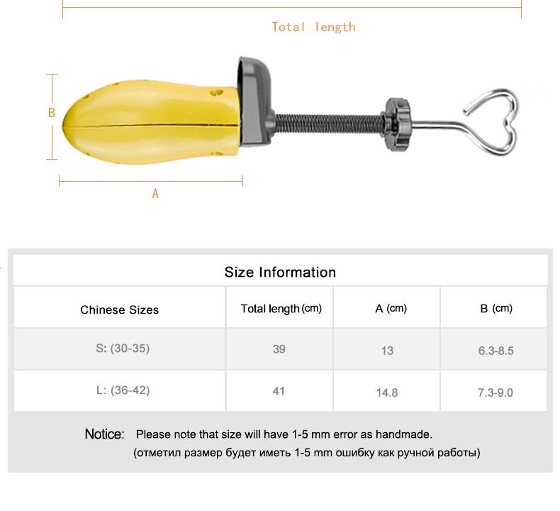 Ширина регулируемое расстояние: S: 0-2,2 см L: 0-1,7 см Цвет: желтый, розовый Для растяжения Длина: Поверните круглую пластиковую ручку по часовой стрелке, пока вы не увидите давление поверхности на обуви. Не перенапряжение! Для растяжки Ширина: Поверните металлическую Ручка стеклоподъемника по часовой стрелке, пока вы не начнете видеть давление поверхности на обуви. Не перенапряжение! Для достижения наилучших результатов: Оставьте носилки для обуви на месте не менее 24 часов. Для удаления носилок из обуви: Поверните ручки в направлении против часовой стрелки.