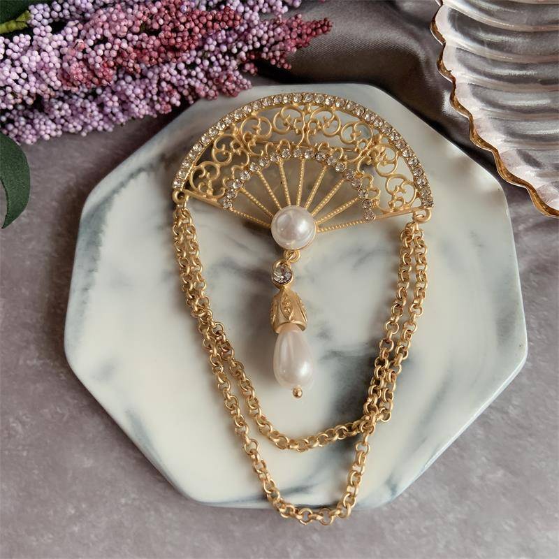 Винтажная веерообразная ажурная новая брошь в стиле ретро в стиле барокко Dong Feng В этом сундуке изображены антикварные бахромы в стиле ретро, идеально подходящие для встреч на улице, банкета с другой одеждой, демонстрации разных вкусов, тонкой инкрустированной жемчужиной и дрелью, каждый угол яркий, искусственный жемчуг не будет очень грубым, но, напротив, придайте людям гладкое и симметричное зрение.