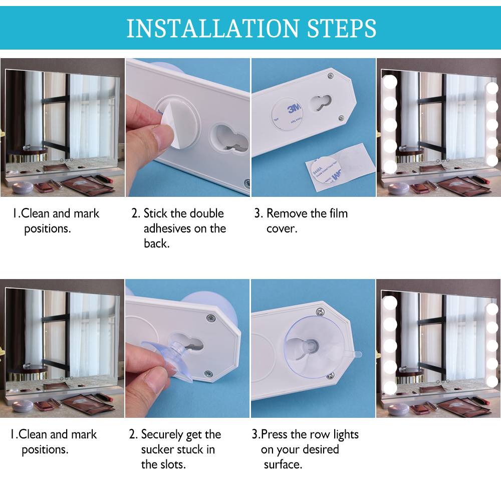 > Особенности 1. Регулируемый эффект освещения: полностью 5 затемнения светодиодный лампы с 3 цветовых режимов и 10 уровней яркости, простое переключение и регулировать нажатием кнопки 。 2. Простая установка: поставляется с полезным набором для установки, который включает в себя двухсторонние клейкие прокладки и сильные поглощающие присоски для установки дрели бесплатно. 3. Гибкие применения: широко применяется для заполнения естественного светильник для безупречного макияжа, съемки и селфи или дома DIY, также может быть помещен на стены, чтобы работать как ночной Светильник в темной среде, или Украсьте столешницы и столешницы, гардеробную и ванную комнату. > Технические характеристики: Материал: абажур из поликарбоната, держатель лампы из АБС-пластика Количество ламп: 5 ламп Светильник режимы: 3 режима (теплый белый свет, холодный белый свет, Дневной светильник белый) Цветовая температура: 3000K (теплый белый), 4500K (холодный белый), 8000K (дневной белый) Уровни яркости: 10 уровней Мощность: 8 Вт (макс.) Питание: Стандартный USB 5V 2A Расстояние между лампочками: appr. 70 мм Диаметр лампы: appr. 45 мм Держатель лампы (основание) Длина: 340 мм Длина провода: appr. 230 мм > Обратите внимание: 1. Пожалуйста, прижмите изделие в течение 30 секунд при наклеивании ламп на поверхность для усиления эффекта фиксации чехол легко отбрасывается, И это займет 24 часа, чтобы достичь идеальной прочности клея после пасты. 2. Пожалуйста, учитывайте погрешность в 1-3 см из-за ручного измерения и убедитесь, что вы не возражаете перед покупкой. 3. Цвет фактического товара может незначительно отличаться от изображения из-за различных компьютерных экранов и настроек дисплея. Спасибо за понимание!