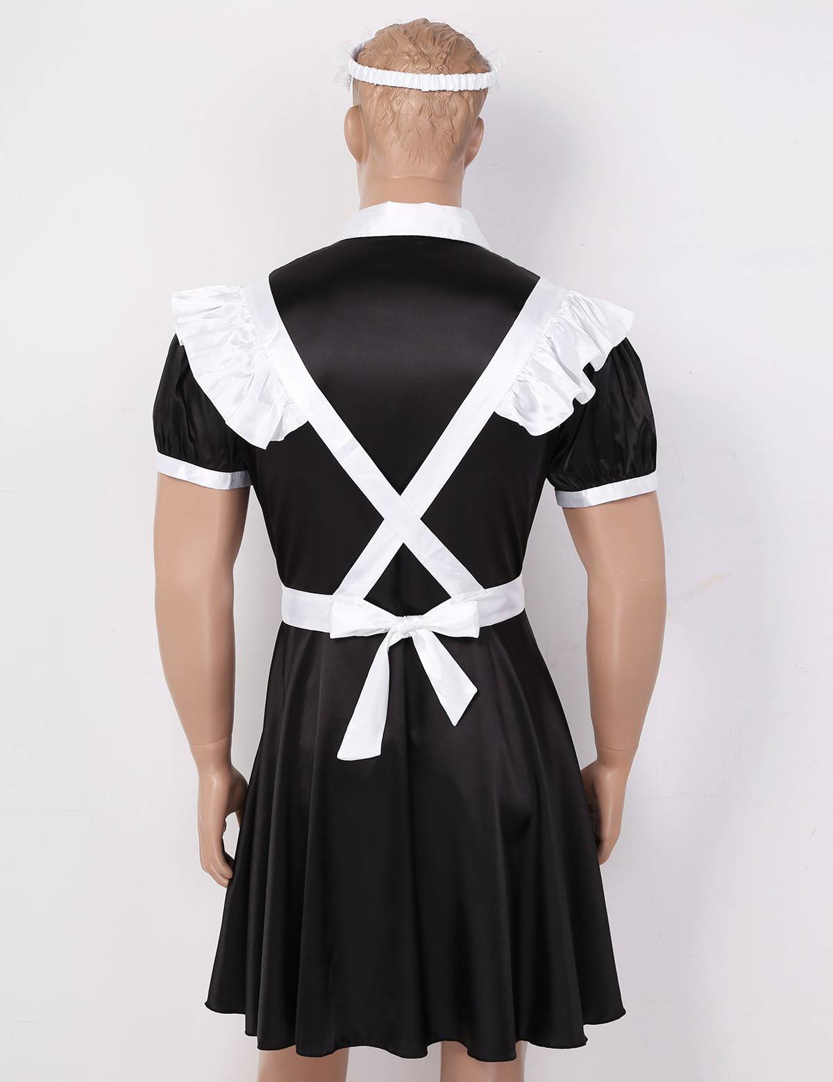 Отложной воротник и короткие рукава-фонарики, дизайнерское платье на пуговицах спереди, поставляется с отдельным фартуком и повязкой на голову.