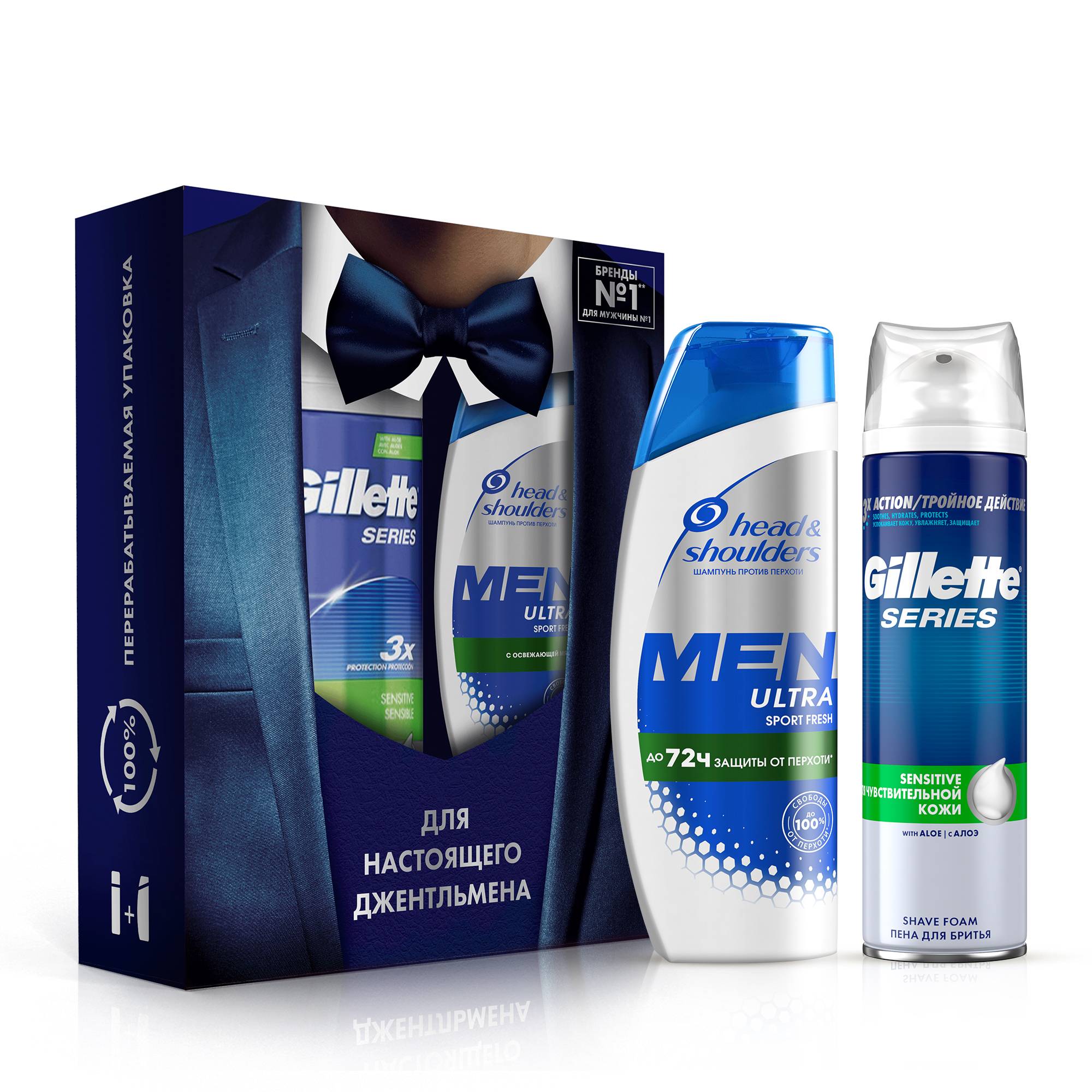 Бренды №1 для мужчины №1! Подарочный набор "Для настоящего джентльмена" от Head & Shoulders (Хед энд Шолдерс) и Gillette (Джилет) – идеальный подарок мужчине для ухода за волосами, кожей головы и телом. Мужской шампунь Head & Shoulders Men Ultra Sport Fresh 200мл с освежающей мятой ухаживает за волосами и кожей головы и придает невероятную свежесть. Подойдет даже для самого требовательного мужчины! Пена для бритья Gillette Series 250мл для чувствительной кожи смягчает и успокаивает кожу, увлажняет и обеспечивает дополнительную защиту от раздражения. Подарите мужчине ощущение свежести и чистоты на целый день – позвольте ему быть настоящим джентльменом с Head & Shoulders и Gillette!