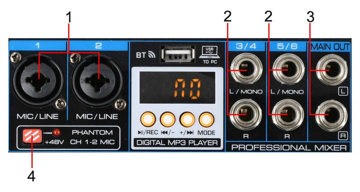 1.[MIC/LINE] моно входПодключите Микрофон, музыкальный инструмент или аудиоустройство (CD проигрыватель и так далее) к устройству.Розетки поддерживают разъем XLR и несимметричный разъем 1/4 ".2. Вход стерео канала.При подключении только к разъему L/(MONO) миксер отправит один и тот же моно сигнал на выходы L и R.3.[основной] выходПодключает активный динамик или усилитель.4.[+ 48В PHANTOM] Кнопка/светодиодныйКогда кнопка включена, светодиодный светильник включен, обеспечивает DC + 48V фантомное питание для XLR plug на MIC mono вход.Включите эту кнопку при использовании конденсаторного микрофона, который питается от фантомной мощности.