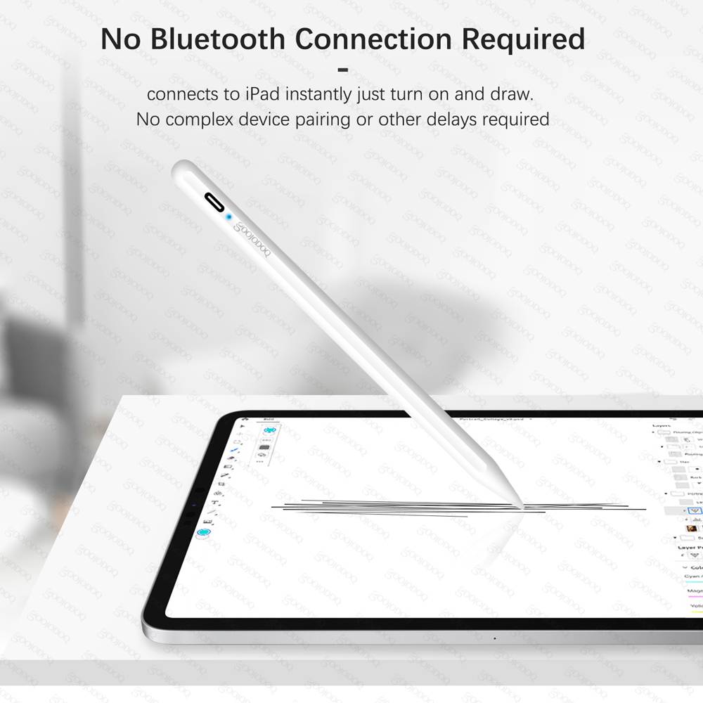 Bluetooth не требуется, просто прикоснитесь к верхней части ручки и сразу начните писать или рисовать-это так просто! Стилус Goojodoq мгновенно подключается к iPad без сложного сопряжения устройства или других задержек. Вы просто нажимаете на кнопку питания, светодиодный светильник включается синим цветом, стилус для iPad начинает работать. С CE, FCC, PSE и ROHS сертификацией