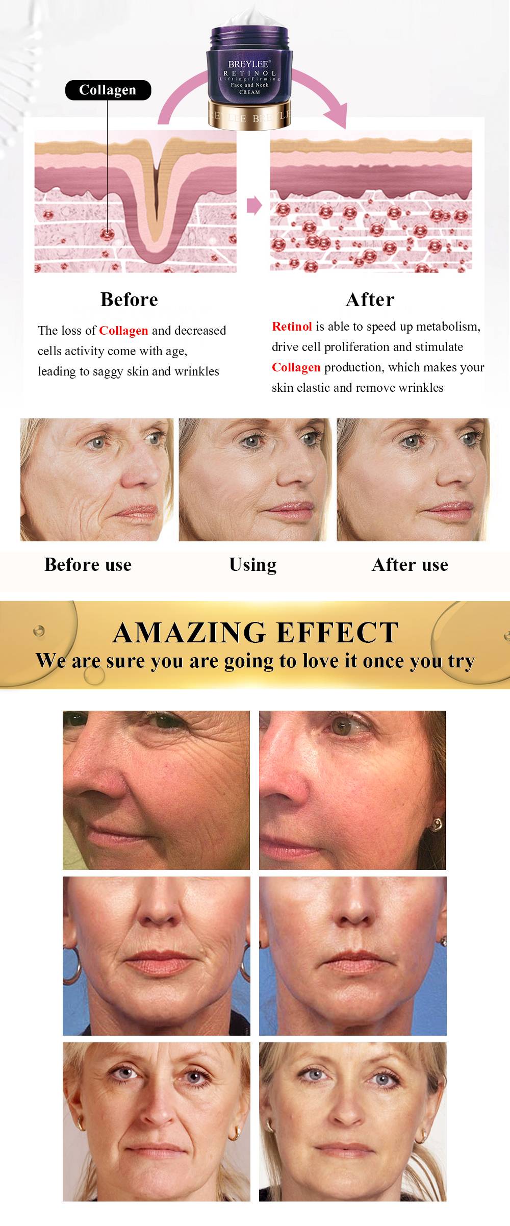 Перед тем, как Потеря коллагена и уменьшение активности в клетках достигают возраста, приводя к обвисшей коже и морщинам После того, как Ретинол может замедлять процесс обмена веществ, стимулирует пролиферацию клеток, стимулирует выработку коллагена, что делает вашу кожу эластичной и устраняет морщины Потрясающий эффект Мы уверены, что вам понравится, как только попробуете