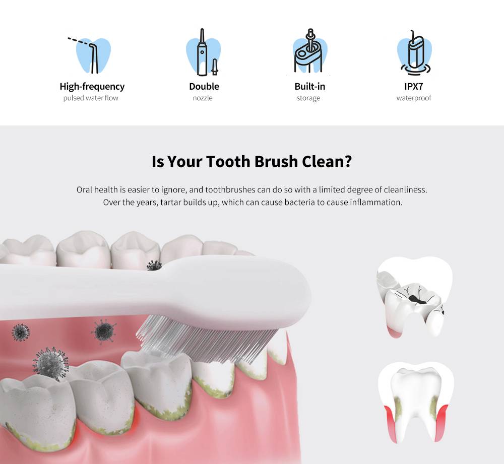 Устройство для чистки зубов может глубоко очистить зубы, попроститься с зубным налетом и одновременно предотвратить полости рта. Он может удаление калькулятора укрепляют десны, укрепление зубов Высокая частота импульсного потока воды Он излучает 1350 высокочастотную импульсную воду в минуту, что позволяет легко смывать остатки и грязь, прикрепленные к деснам. Сделайте зубы белыми