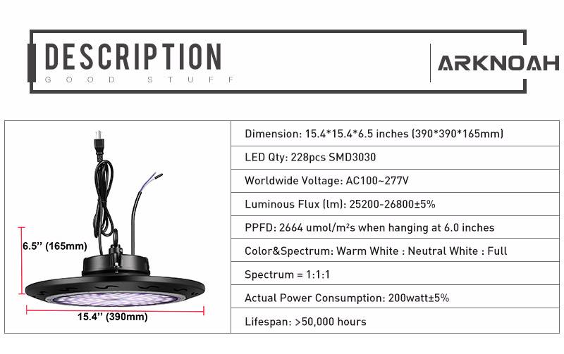 Размер: 15,4*15,4*6,5 дюйма (390*390*165 мм) Кол-во светодиодов: 228 шт SMD3030 Напряжение по всему миру: 100 ~ 277 В переменного тока Световой поток (лм): 25200-26800 ± 5% PPFD: 2664 мкмол/м² S при подвешивании на 6,0 дюйма Цвет и спектр: теплый белый: нейтральный белый: полный спектр = 1:1:1 Фактическое потребление энергии: 200 Вт ± 5% Срок службы:> 50000 часов