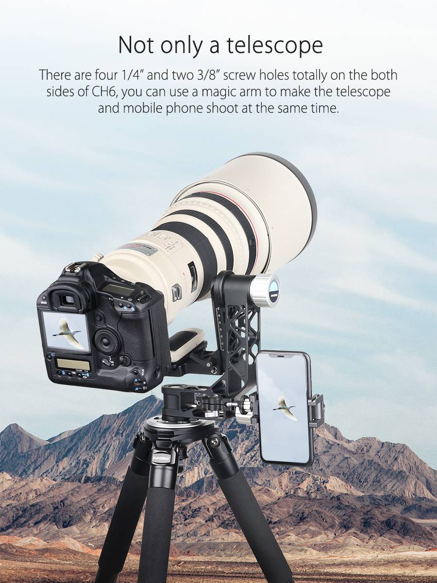 【Расширяемый винт hole】есть четыре 1/4 "и два 3/8" винтовых отверстия полностью на обеих сторонах CH6, вы можете использовать волшебную руку, чтобы сделать телескоп и мобильный телефон одновременно. И, мы предоставляем рычаг угла бесплатно, так что вы можете легко настроить угол съемки, который вы хотите.