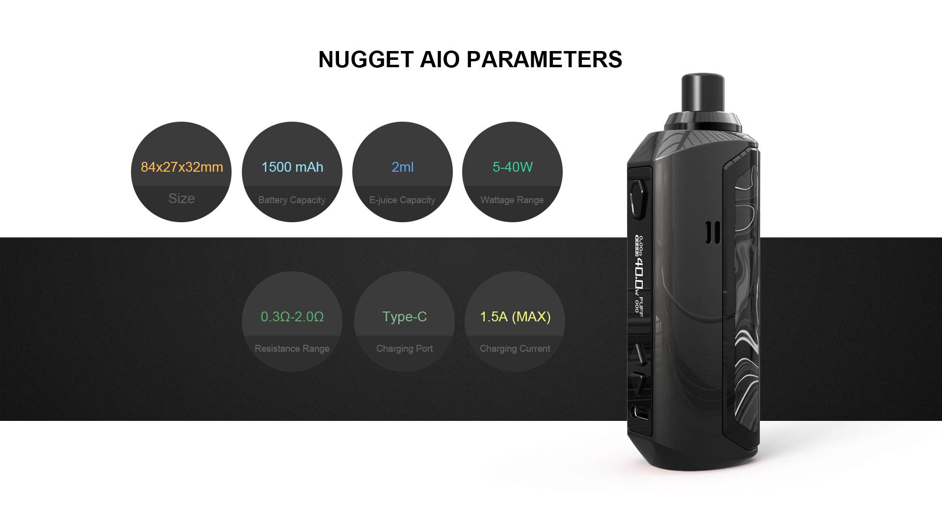Тепло приветствуем нового члена семьи Nugget-артерия Nugget AIO 40W Pod Kit! Если вы ждете компактной системы pod с сильной мощностью, то артерия Nugget AIO Pod-лучший вариант для вас! Nugget AIO Pod питается от встроенного аккумулятора 1500 мАч и выключает максимальный выход 40 Вт. Яркий светодиодный экран, чтобы показать вам все необходимые детали. Nugget также поддерживает быструю зарядку 1.5A с портом зарядки Type-C. Более того, артерия Nugget AIO pod kit поставляется с легким магнитным соединением между емкостью 2 мл и батареей и большим окошком e-juice, которое легко увидеть уровень e-juice. Плюс легкий дизайн сверху и регулируемый нижний поток воздуха, просто возьмите его домой и наслаждайтесь фантастическим паром!