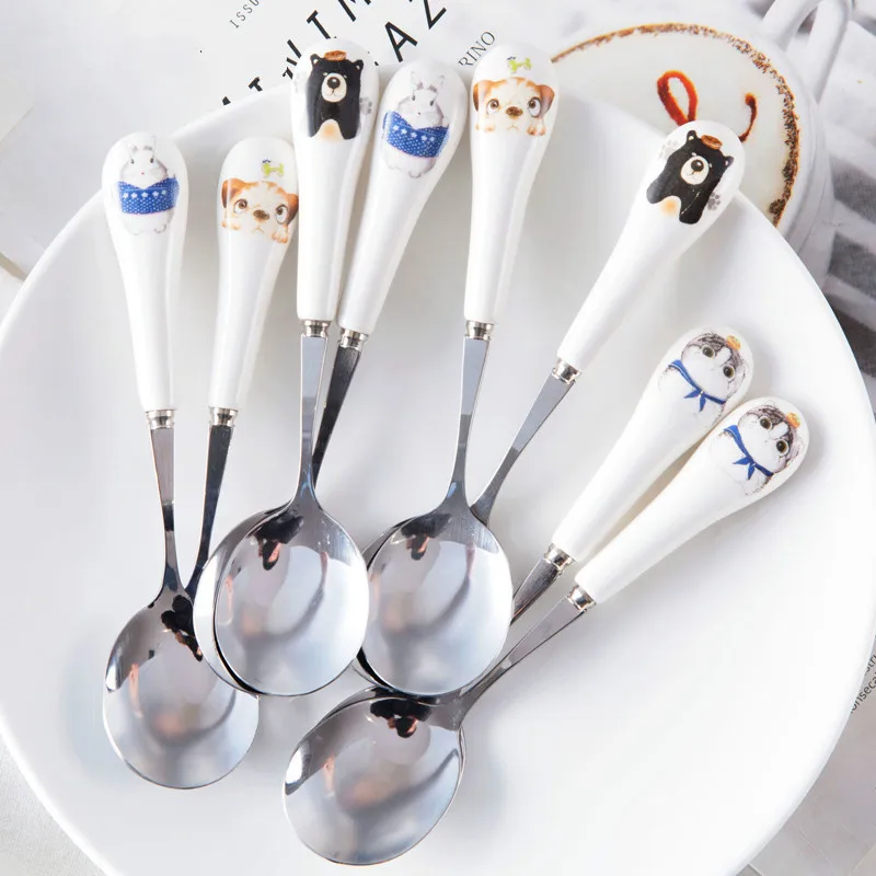 Особенности -Изготовлен из пищевого материала из нержавеющей стали, он не ржавеет, имеет длительный срок службы, сохраняет безопасность и здоровье между тем. -Керамическая симпатичная ручка-дизайн, удовольствие от еды, пусть вы и ваш ребенок влюбитесь в ужин. -Легко чистить, Гладкий полированный край не режет вашу кожу. -Используется для кофе, чая, десертов, закусок, долговечность на каждый день с прочным блеском. -Отличный подарок для детей, детей, малышей, младенцев. Позвольте детям насладиться моментом еды. Посылка в комплекте