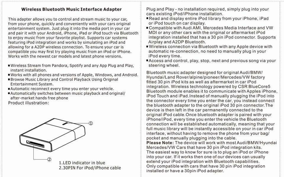Особенности: -Bluetooth медиапотоковая передача для Audi, VW, Mercedes Benz, BMW, Alpine Автомобильные стереосистемы. Работает с большинством автомобилей с 30 контактными комплектами для интеграции iPod. (30 контактный разъем для подключения iPod кабель не входит в комплект, вам будет нужно покупать отдельно или использовать ваш существующий кабель) -Подключи и работай, установка не требуется, просто подключите к вашим автомобилям существующую iPod/розетка среды передачи информации, Поддержка беспроводного потока от Pandora, Spotify и любого приложения! -Позволяет делать паузу, просматривать, пропускать и управлять воспроизведением музыки с помощью оригинального рулевого колеса и Главного управления -Автоматическое повторное подключение каждый раз, когда вы входите в транспортное средство, не нужно вручную подключать ваш iPod каждый раз -Чтение и отображение всей музыкальной библиотеки iPod на оригинальном автомобильном экране с вашего iPhone, iPad, iPod (Совместимость с транспортными средствами, которые уже поддерживают дисплей библиотеки iPod) -Музыкальный адаптер Bluetooth для Audi/BMW/Mercedes/BMW,Mini Cooper,Jaguar,Infiniti,Nissan,Hyundai, автомобильные стереосистемы KIA и Alpine, которые работают с 30 контактными встроенными комплектами iPod. 1. Подключи и играй, предназначен для интеграции беспроводной Bluetooth потоковой передачи музыки. 2. Просто Подключите устройство к разъему медиа-интерфейса и подключите его к телефону через bluetooth. 3. Адаптер автоматически подключается к последнему сопряженному устройству при включении автомобиля. 4. Работает с iPhone, Android или любыми другими устройствами с поддержкой bluetooth. Функция обновления: -Цветной светодиодный индикатор. -Позволяет просматривать iPod library и управлять воспроизведением с помощью оригинальной развлекательной системы с вашего iPhone, iPad или iPod touch на автомобильном дисплее! -Только для устройств Apple Поддержка рулевого управления и поддержки библиотеки. -Позволяет получить доступ и управлять воспроизведением, остановкой, следующей и предыдущей песней через многофункциональное рулевое колесо. -Поддержка беспроводного потока от Pandora, Spotify и любого приложения! -Информация о песне будет поддерживаться на экране развлечения автомобиля. (Только музыка воспроизводится из библиотеки iTunes; Для других адаптеров некоторые функции могут быть ограничены) Примечание: 1,30 контактный разъем для подключения iPod кабель не входит в комплект, вам будет нужно покупать отдельно или использовать ваш существующий кабель 2. Из-за различий в развлекательных системах различных моделей автомобилей и производственных лет Совместимость не может быть полностью гарантирована. 3. Если у вас возникли проблемы, пожалуйста, свяжитесь с нами. Посылка включает в себя: 1 X Bluetooth